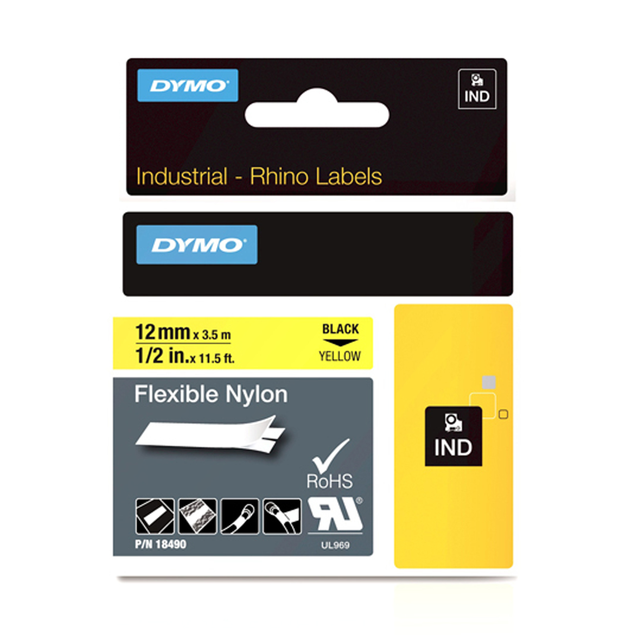Нейлоновая, гибкая лента Dymo S0718080/18756/18490, черный текст на желтом фоне. Ширина 12 мм, длина 3.5 м.