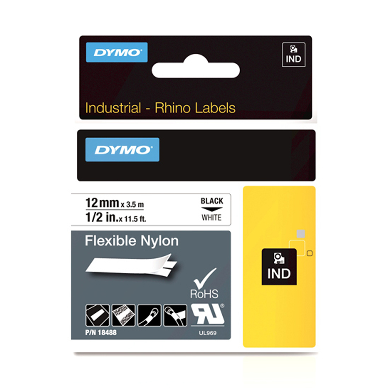 Нейлоновая, гибкая лента Dymo S0718100/18758/18488, черный текст на белом фоне. Ширина 12 мм, длина 3.5 м.