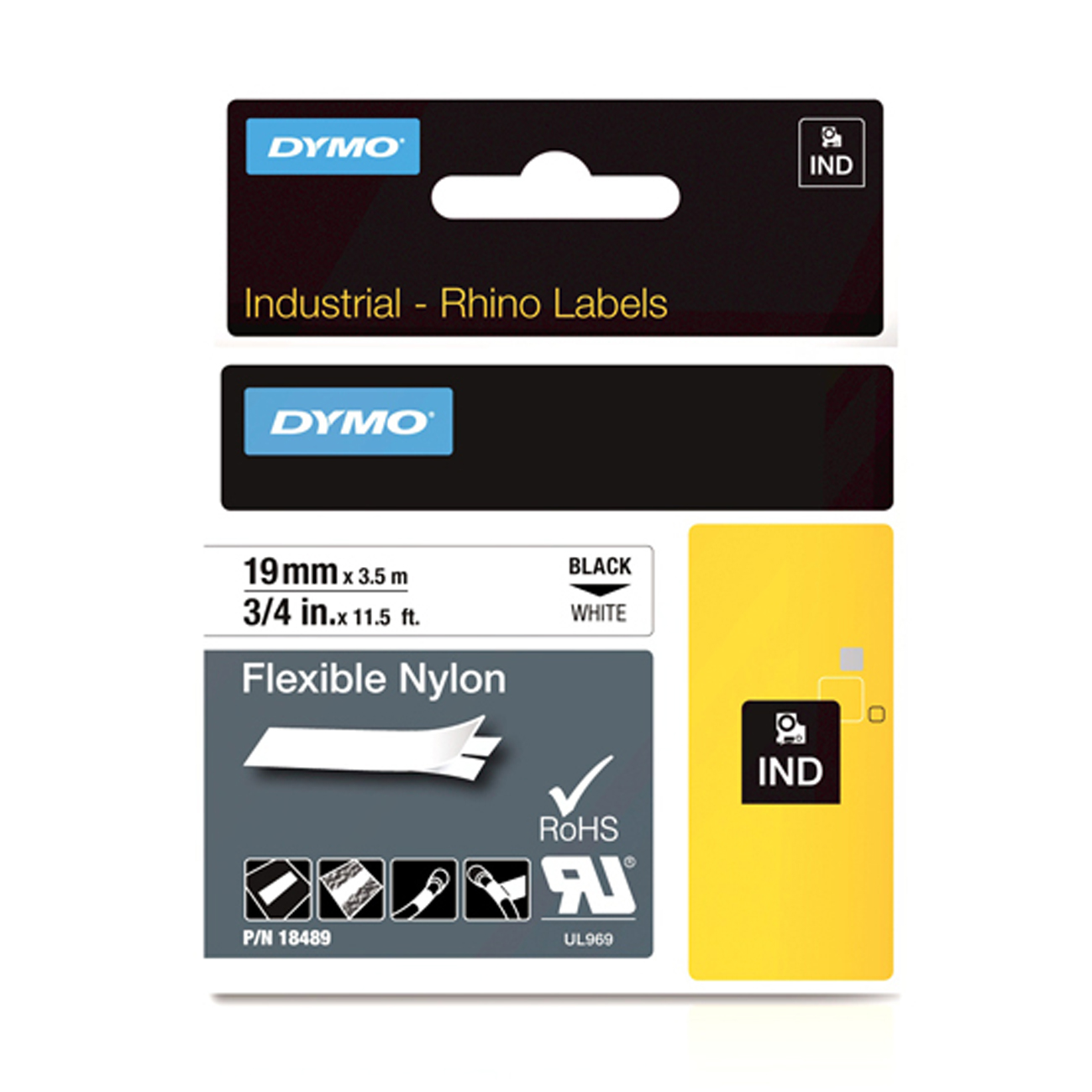 Нейлоновая, гибкая лента Dymo S0718120/18759/18489, черный текст на белом фоне. Ширина 19 мм, длина 3.5 м.