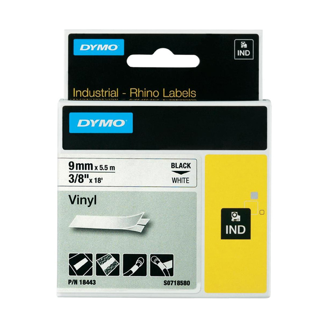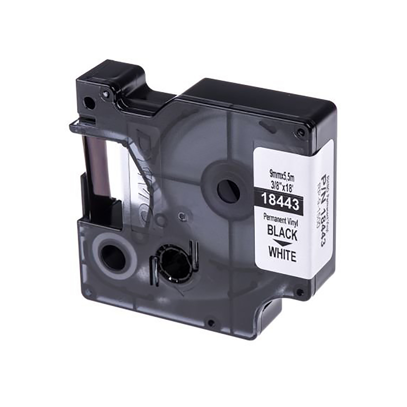 Виниловая лента Dymo S0718580/18443 черный текст на белом фоне. Ширина 9 мм, длина 5,5 м.